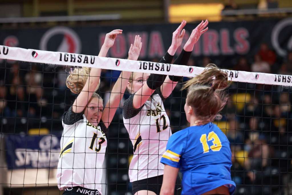 (PHOTO): Cherokee Washington’s Kadyn Volkert (13) and Cherokee Washington’s Deidra Doeden (12) try to block Humboldt’s Mia Schluter (13) shot during Iowa High School Volleyball State Tournament at Xtream Arena in Coralville Tuesday, November 4, 2025. (Amir Prellberg/The Gazette)