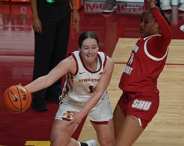 (PHOTO): Iowa State Cyclones’ guard Reese Beaty (1) passes the ball around Sacred Heart Pioneers center Esther Kursite (14) during the second quarter on Nov. 9, 2025, at Hilton Coliseum in Ames, Iowa.Nirmalendu Majumdar/Ames Tribune