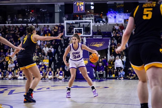 (PHOTO): UNI’s Kaylynn Janes (34) is guarded by Iowa’s Addie Deal at the McLeod Center in Cedar Falls on Nov. 16, 2025. (Photo: Andy Saigh, UNI Athletics)