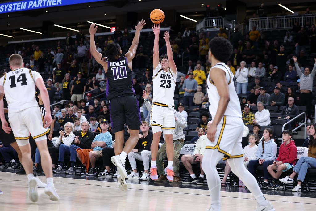 (Photo Above): Iowa sophomore guard/forward Isaia Howard (23) shoots the ball over Grand Canyon’s senior guard Jaden Henley (10). Iowa defeated Grand Canyon to win the Acrisure Classic in Palm Desert, Calif., on Wednesday, Nov. 26, 2025.