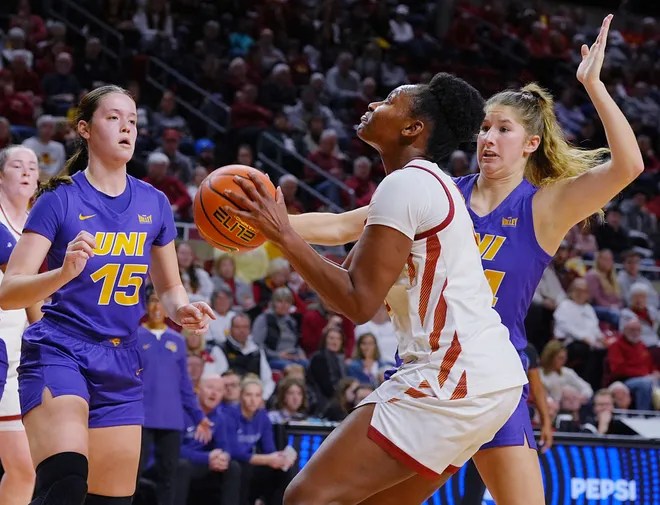 Iowa State Cyclones’ forward Alisa Williams (3) shoots the ball around Northern Iowa Panthers forward Elise Jaeger (15) and Northern Iowa guard Virginia Edmondson (4) during the second quarter on December 14, 2025, at Hilton Coliseum in Ames, Iowa. (Photo/Niramalendu Majumdar, Ames Tribune)