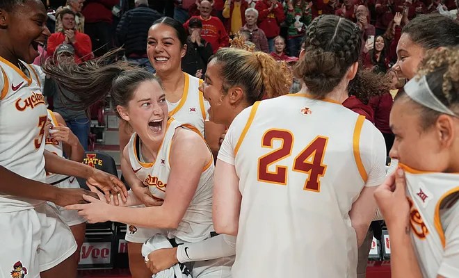 Iowa State Cyclones’ guard Kenzie Hare (12) celebrates with teammates after her game-winning shot against Kansas in the Big-12 conference home opener on Dec. 21, 2025, at Hilton Coliseum in Ames, Iowa. (Photo/Nirmalendu Majumdar/Ames Tribune