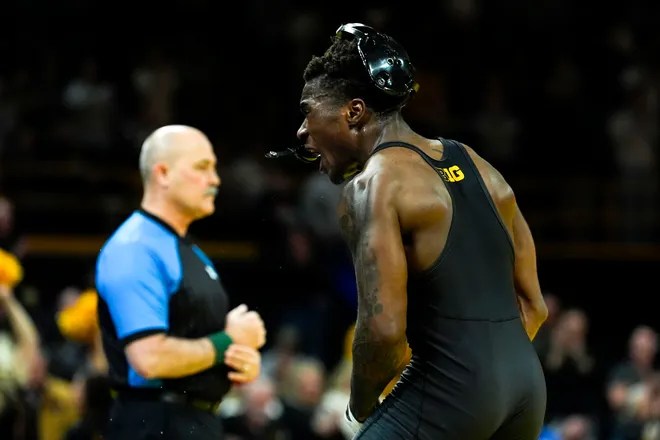 Iowa’s Nasir Bailey reacts after defeating Penn State’s Braeden Davis in a 141-pound match Jan. 16, 2026 at Carver-Hawkeye Arena in Iowa City, Iowa. (Photo: Julia Hansen/Iowa City Press-Citizen)