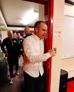 (Photo Above: Iowa coach Ben McCollum and his assistant coaches in the locker room after the win at Indiana. Photo courtesy of hawkeyesports.com.