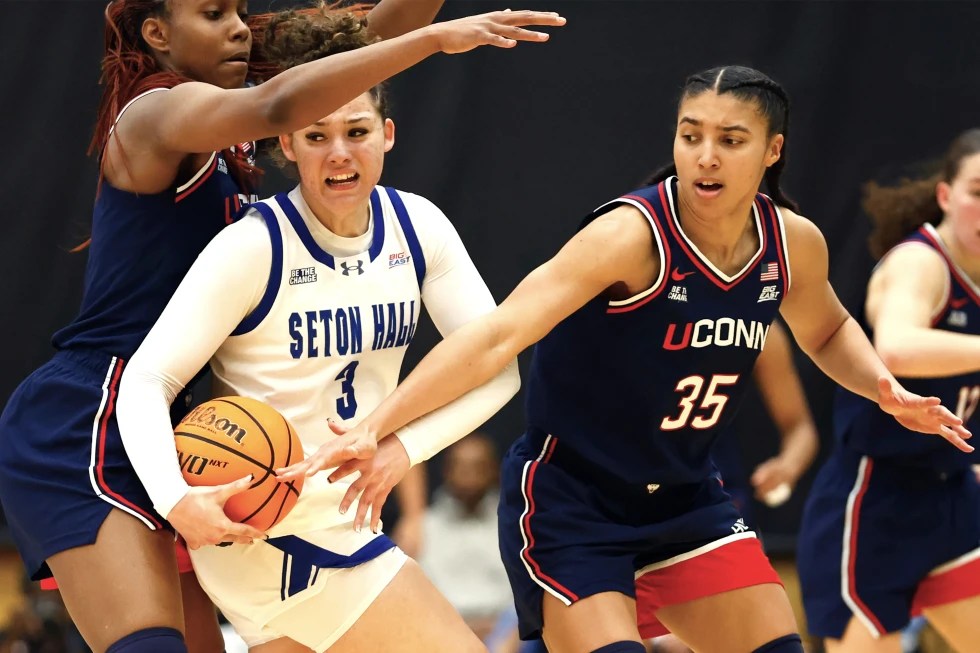UConn guard Blanca Quinonez (4) and UConn guard Azzi Fudd (35) defend against Seton Hall forward Natalia Hall-Rosa (3) during the second half of an NCAA women’s college basketball game, Saturday, Jan. 24, 2026, inm SOuth Orange, NJ (AP Photo: Noah K. Murray)