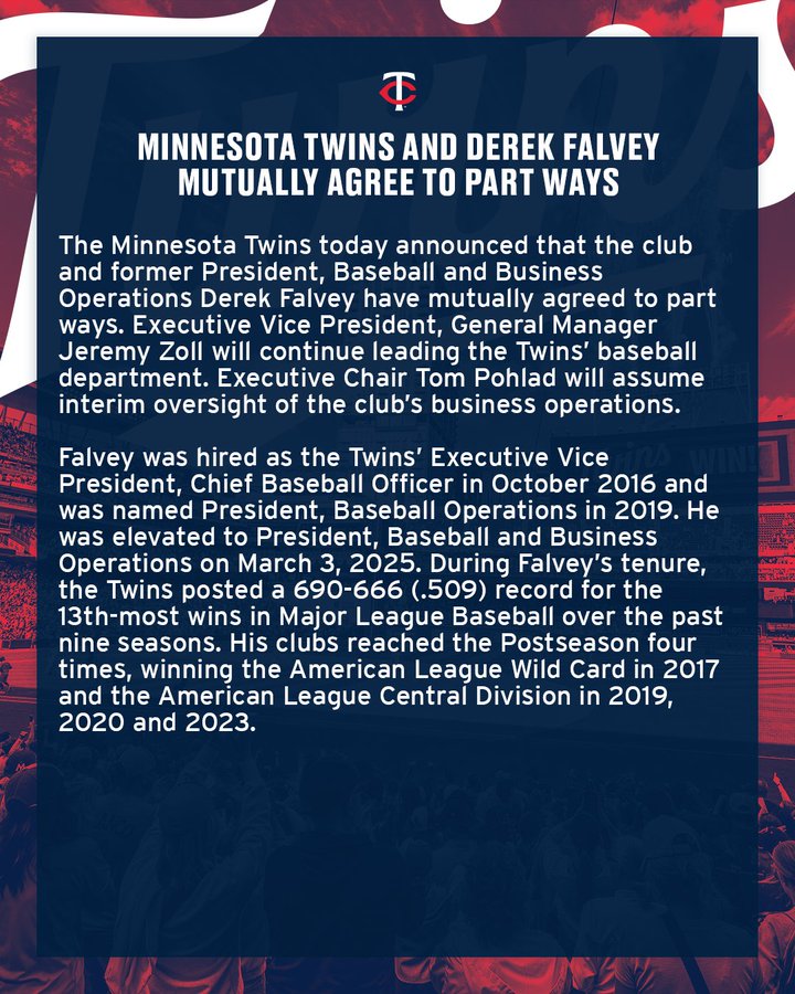 Those changes were also recognized by Tom Pohlad. “Over the past several weeks, Derek and I had thoughtful and candid conversations about leadership, structure, and the future of the club,” Pohlad wrote in the team’s press release. “We reached a shared understanding that the needs of the organization are evolving and that a leadership transition is the best way to move forward.”