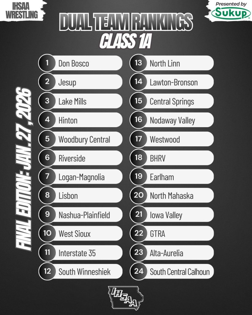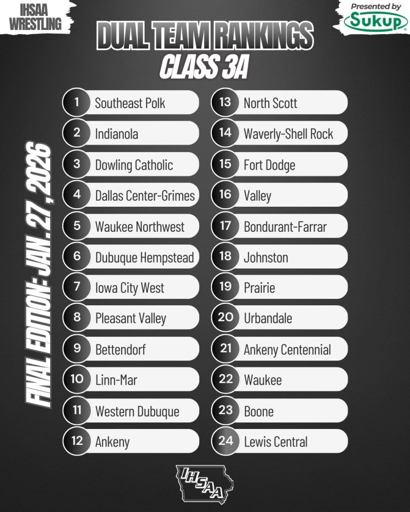 Regional dual meets are currently scheduled for Tuesday, Feb. 3. The 2026 IHSAA State Dual Team Wrestling Tournament is set for Saturday, Feb. 7 at Xtream Arena in Coralville.