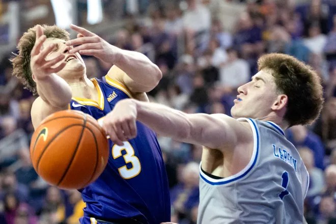 Drake guard Owen Larson (1) knocks the basketball away from UNI guard Max Weisbrod (3) Feb. 15, 2026 during a Missouri Valley Conference game at the McLeod Center in Cedar Falls, Iowa. (Photo: Julia Hansen/Iowa City Press-Citizen)