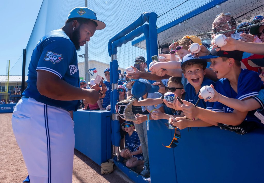 Toronto Blue Jays Vladimar Guerrero Jr. signs autographs for young fans before a spring training game against the Philadelphia Phillies in Dunedin, Fla., Saturday, Feb. 21, 2026 (Frank Gunn, the Canadian Press via AP)