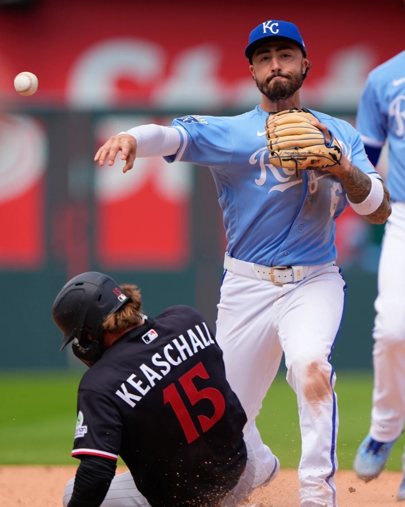 Kansas City Royals second baseman Jonathan India throws to first for the double play hit into by the Minnesota Twins’ Victor Caratini after forcing out Luke Keaschall (15) out at second during the third inning of a baseball game Thursday, April 2, 2026, in Kansas City, Mo. (AP Photo/Charlie Reidel)
