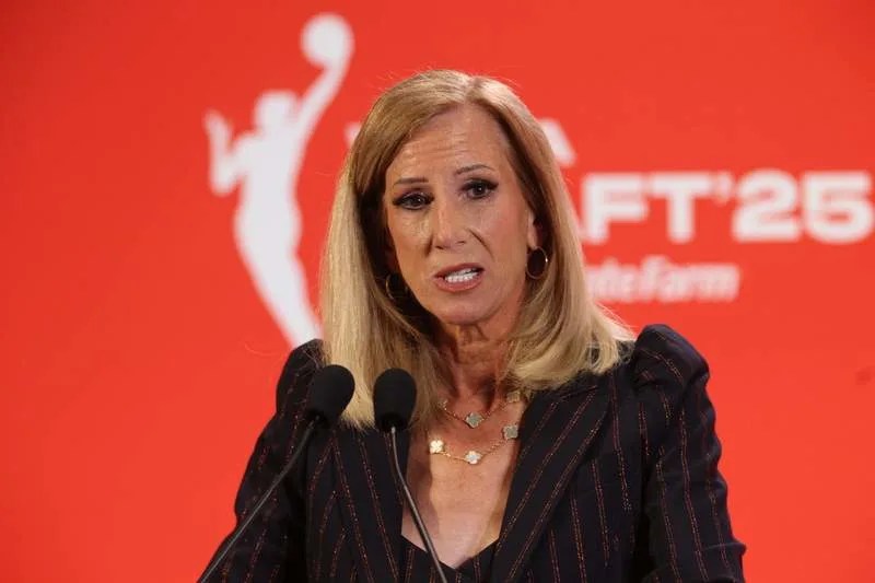 WNBA commissioner Cathy Engelbert talks to the media in New York before the 2025 WNBA Draft (April 14, 2025) at The Shed at Hudson Yards. (Photo/Vincent Carchietta-Imagn Images)
