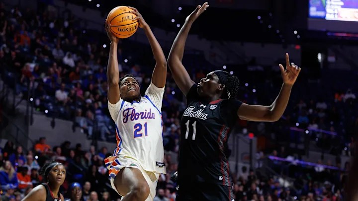 Florida Gators center Gift Ezekiel (21) attempts a layup over South Carolina Gamecocks center Madina Okot (11) during the second half at Exactech Arena at the Stephen C. O’Connell Center. (Photo: Matt Pendleton-Imagn Images)