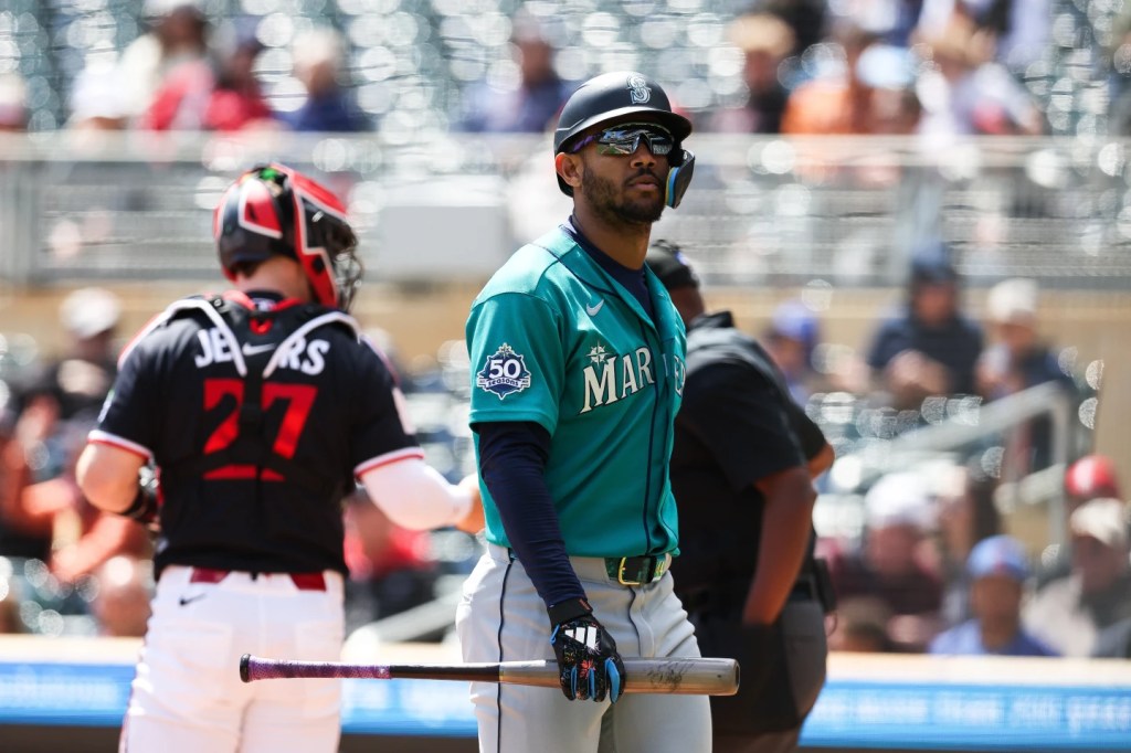 Seattle Mariners’ Julio Rodriguez strikies out during the first inning of a baseball game against the Minnesota Twins, Wednesday, April 29, 2026, in Minneapolis. (AP Photo/Stacy Bengs)